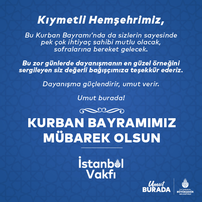 İstanbul Vakfı Kişisel Verilerin Korunması ve İşlenmesi Aydınlatma Metni’ni okudum. Kişisel verilerimin aydınlatma metninde belirtilen amaçlar için işlenmesine ve paylaşılmasına ayrıca; İstanbul Vakfı’nın Kurban bayramı kapsamında kurban keserek engelli, yoksul, yaşlı ve her türlü ihtiyaç sahibi İstanbullulara yıl boyunca kurban eti dağıtmak amacıyla yapmış olduğu yardım kampanyasına katılmam sebebi ile paylaştığım her türlü kişisel verimin işlenmesine, ilgili iş ortakları ile paylaşılmasına, adımın ve soyadımın kurban kesimi esnasında zikredilmesi sırasında çekilen videonun linkinin paylaşılmasına, tüm bu kişisel verilerimin Vakfın faaliyetlerinin planlanması ve icrası amaçları da dahil olmak üzere faaliyetlerinin gerçekleştirilmesi amacıyla; toplanmasına, işlenmesine, veri tabanında tutularak periyodik olarak güncellenmesine ve saklanmasına, gerektiği takdirde ilgili kamu kurum ve kuruluşlarıyla, 3. kişilerle, İstanbul Büyükşehir Belediyesinin İştirakleri ve Bağlı kuruluşlarıyla, faaliyetlerinin yürütülmesi için Türkiye’de veya yurtdışında mukim olan; hizmet aldığı, birlikte çalıştığı kuruluşlarla, hizmet sağlayıcı firmalar ile paylaşılmasına muvafakat ediyorum.
